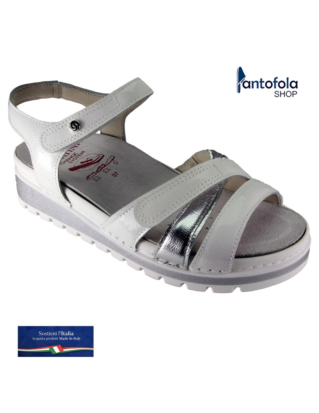 Sandalo caratterizzato da uno stile nuovo, giovane ed originale. Articolo che fa parte di una nuova linea, nuovi pellami morbidi e giovanili, calzatura leggerissima e masssimo confort. Tomaia dai colori e pellami innovativi. Massima attenzione per i dettagli. La comodità che si lega con l'estetica.  Buona  regolazione grazie agli strappi in velcro e alle varie parti elastiche che permettono alla calzatura di  adattarsi a piedi di qualsiasi tipo. Fondo in gomma antiscivolo. Nuovo plantare in lattice, molto morbido con la caratteristica di ammortizzare il peso del corpo riducendo il carico sulle articolazioni oltre che estraibile per alloggiare quello ortopedico su misura. Tacco alto 4.2 cm circa .